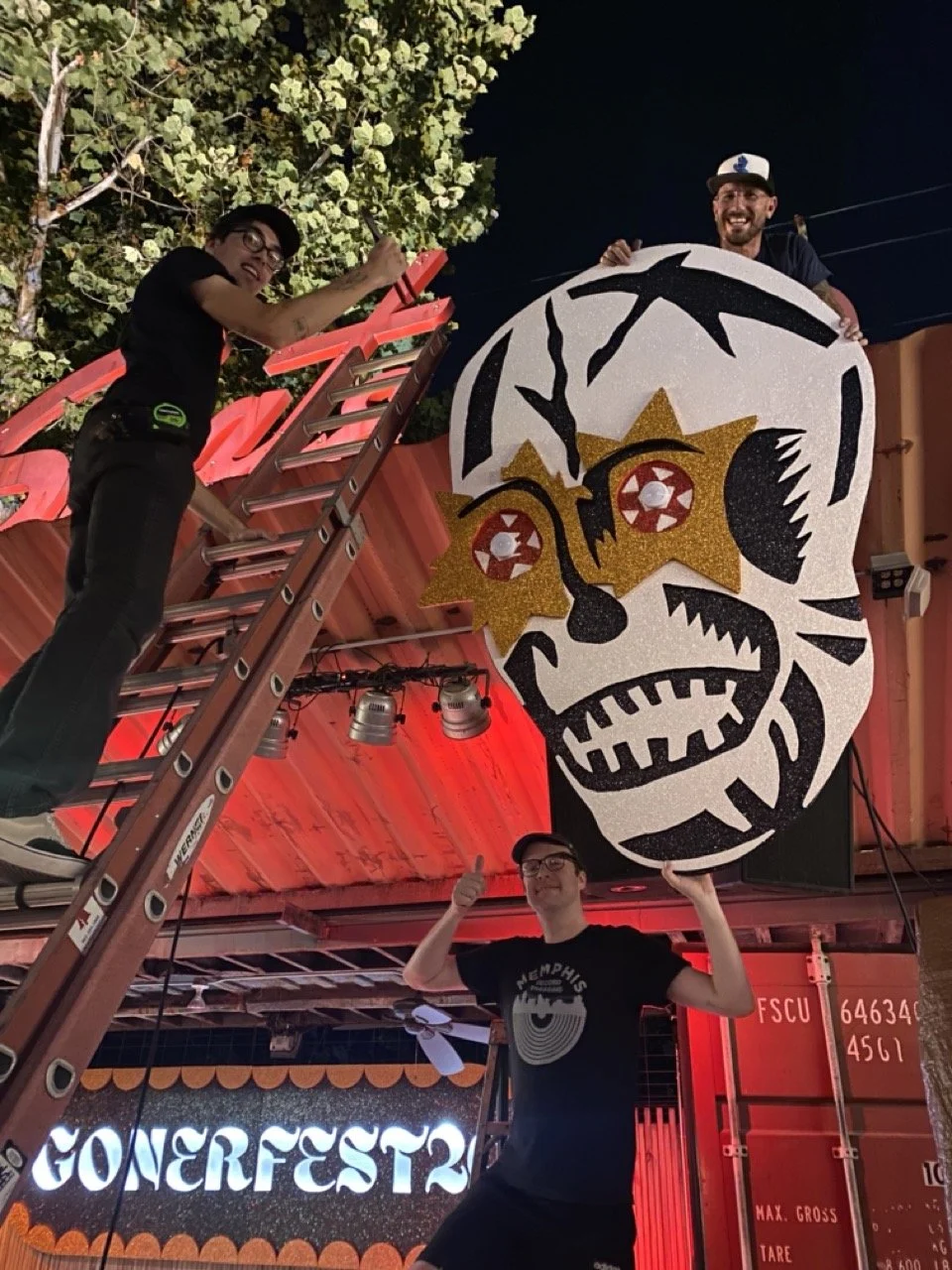The Goner crew installing massive skulls designed and built by Moseley for Goner Fest 21. Photo courtesy of Sara Moseley.
